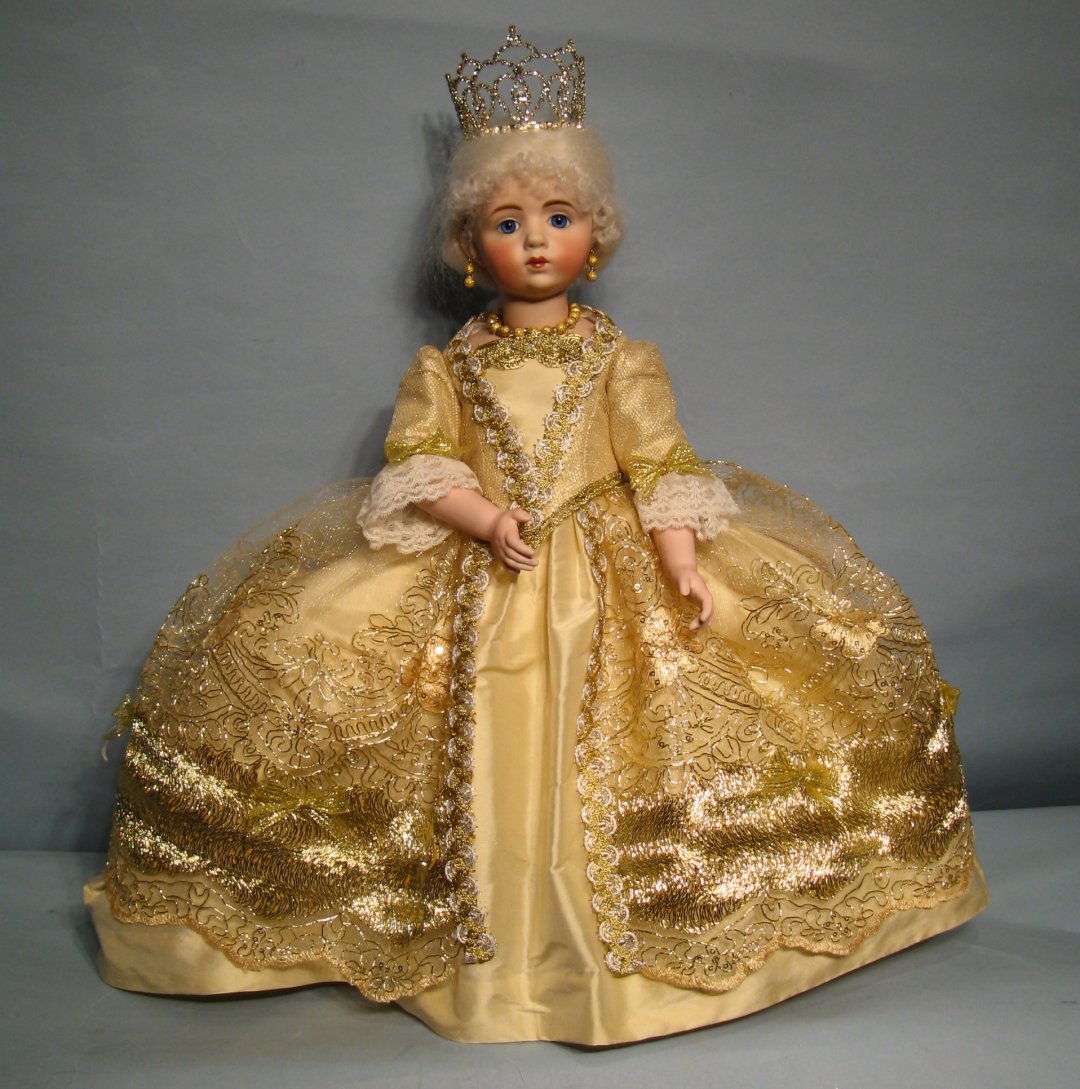 The second of the A.Marque queens is Queen Marie Leszcynska (1715-1774). She was the wife of Louis XV and the grandmother of Louis XVI. She was much loved for her sweet nature and her concern for the French people. My version of this queen is dressed in rose and gold silk taffeta, trimmed with lace and gold.