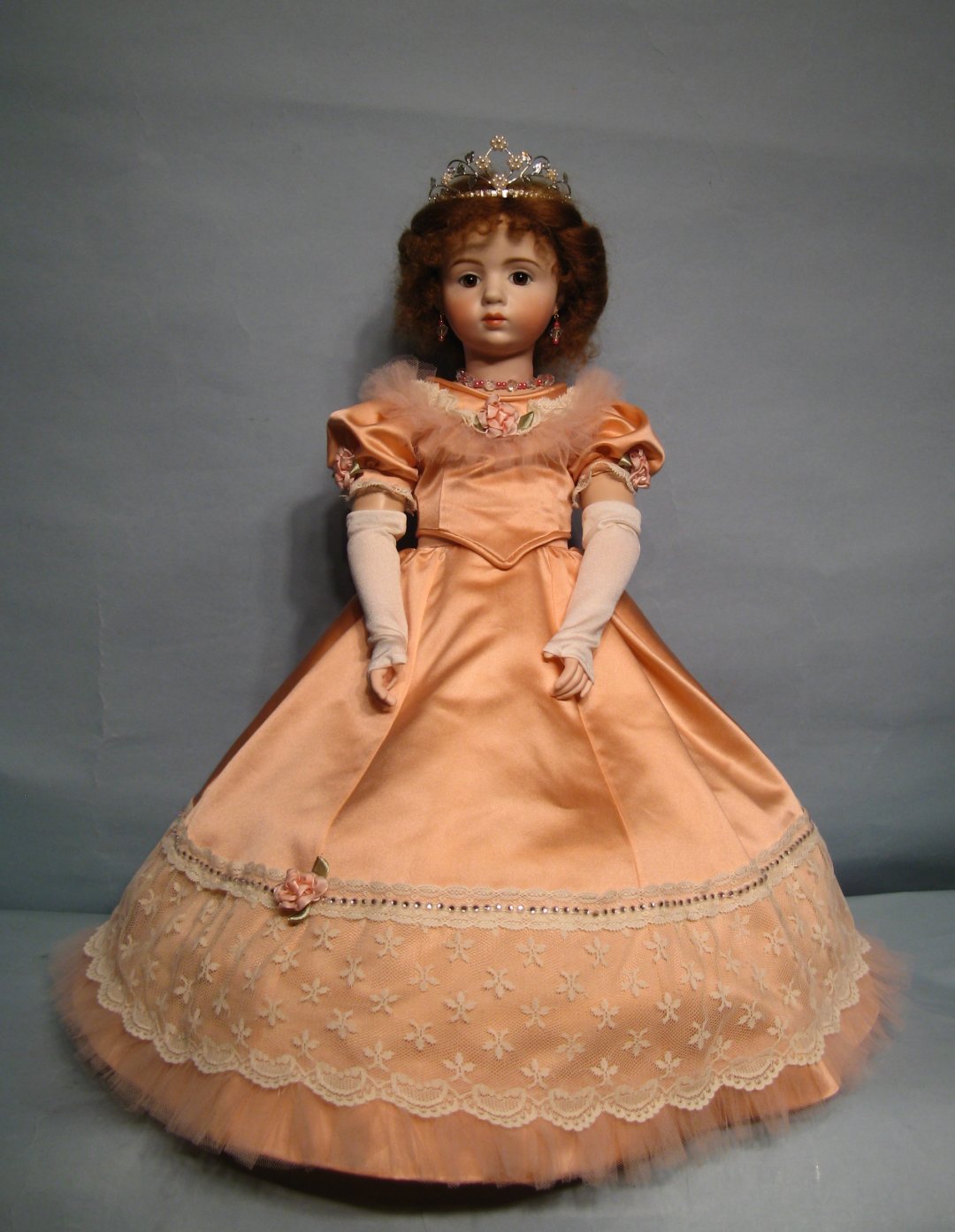 Empress Eugenie (1826-1920) is our final A.Marque queen. She was the wife of Napoleon III. Their meeting and subsequent marriage was like a fairytale. She, in her patronage of the designer, Frederick Worth, changed fashion forever and established Paris even more strongly as the fashion capital of the world. The dress I made for this doll is from a luscious peachy-pink silk satin. It is trimmed with lace and pink tulle, as well as silk flowers. Her gloves are silk knit.