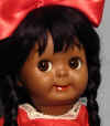 ![]() ![]() ![]() ![]() ![]() #5--8" ethnic Kestner 221 Googlie. This doll has an all-bisque body. Her lovely dark brown complexion is enhanced with deep brown glass eyes and a black Daisy-style wig. She is wearing a cotton lace-trimmed onesie as well as a beautiful pale pink crocheted dress! And look at those pink satin slippers!