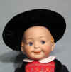 SOLD--16" Hertel Schwab Googlie. I could not resist dressing one of these cute Hertel Schwab googlies in the Brittany Boy costume that you can find on my patterns-for-sale page. Even though he's German, this French regional costume suits him so well. The black wool felt jacket, red wool felt vest and red wool felt gaiters are embroidered in traditional Brittany decoration. His pantaloons, blouse and romper are white cotton. His cumberbund is yellow silk. Shoes and black silk socks, as well as his black velvet hat is included. The doll has a dome head, closed mouth, blue glass eyes that are fixed, and a five piece latex composition body.