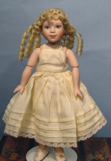 Sold--Shown is a doll made by me from the Rose Pinkul mold for one of her Itty Bitty Sweet Things. This all-bisque multi-jointed doll is about 8". She has painted eyes and a mohair wig. She is dressed in a shepherdess-type dress. Now all she needs are the sheep!