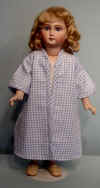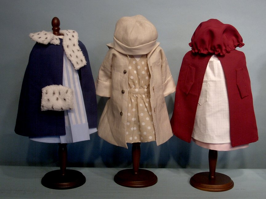 As I was choosing material, I tried to use fabric and trims that I already had on hand. Since I tend to buy pinks, blues, reds, and tans, my fabric choices are very similar to the fabrics suggested on the patterns themselves. As mentioned on my website, these Mary Frances patterns perfectly fit the Seeley's FB14J body. The doll modeling is a reproduction of Bebe Louvre, a Seeley's mold. Her head is on an FB14J body. When sewing all these patterns, I made just a few changes, mostly for design issues. I hardly made any changes at all for fit issues. The patterns were a true pleasure to sew and I think the outfits are quite charming! My camera hasn't really done these little outfits justice, but I hope you enjoy them! ********(Click on the smaller photo to see a larger one.)******** The Wardrobe: Underwear: There are cotton split Drawers (not shown), a Flannel Petticoat, and an Underwaist of cotton with a cotton Lawn Petticoat attached. All pieces are lace trimmed. Nightclothes: Basically the same pattern is used for all of these pieces. The Nightgown is white cotton that's been trimmed with lace and blue ribbon. The blue flannel Bathrobe has a bias cut self fabric binding around the front of the robe and at the bottom of the sleeves. The Kimono is of a pretty stripe/print loose weave cotton. A light green silk has been used to bind the front of the kimono. The Dressing Sacks are both of flannel. One is a rosebud-strewn flannel, trimmed with bows at the front neck. The other Dressing Sack is a pale pink flannel with daisy decoration and ribbon ties at the front. Play Clothes: The bathing suit is white cotton trimmed with red sateen. The rompers are a blue and white check, trimmed with white cotton. These two outfits use some of the same pattern pieces as I'm sure you can tell. Dresses: The pink dress ("Morning Dress") is of beautiful pink cotton sateen, trimmed with white tone-on-tone cotton. The pinafore is of the same tone-on-tone cotton, trimmed with lace. The blue striped dress ("Afternoon Dress") is trimmed with a pale blue cotton. The tan "dress" is actually a white cotton guimpe (or blouse) and a tan and white polka-dot jumper. I used the "Party Dress" pattern for this dress. Coats and Hats: Shown first is the Automobile Coat. It's made of a incredibly gorgeous tan linen. I have saved this material for years and will be so sad when I use the last scrap. The coat is lined in pale pink charmeuse silk. The coat's collar and cuffs are of a heavier cotton. The Polo Cap is made of the same tan linen and the same heavy cotton. And please note the Leggings! The pattern suggested using leather, but I used Ultrasuede instead....it worked like a dream! The Fur-Lined Cape in the dark blue wool is actually not fur lined but blue silk lined. I wanted to keep bulk down. The Cape does have a fur collar that matches the Fur Muff and Tippet. The Fur Muff and Tippet are two of my favorite pieces of the Mary Frances wardrobe! I found some of that so-very-soft bathrobe material that's so popular now ("Minkee"). It had a "furry" appearance. I made the Fur Muff and Tippet out of this plain white "fur" fabric, lining them in pale pink silk. The black "ermine" marks I made with a permanent black marker. I wish I could say that that was my idea but the Mary Frances book suggested something similar in using black ink to make the simulated ermine marks. The Rain Coat is of a red rayon faille. The faille is a vintage fabric dating from the late 1950's. The hood is attached to the Rain Coat. The Sun Bonnet is made of the beautiful pink sateen and tone-on-tone white cotton used for the Morning Dress. There are silk ties. The Automobile Bonnet is made of a small tan flowered print, with the heavy cotton previously used for the Automobile Coat being used for the brim. "Special" Dresses: The Party Dress was shown above in a less fancy cotton, but I made it a second time in a dressier fabric. The guimpe is a delicate pink cotton, trimmed in off-white lace. The dress is of pink silk charmeuse, trimmed with multiple laces and silk buds n' bows trim. The Wedding Dress is of off-white satin. The guimpe is of an all-over pattern lace with a silk underlining. The veil is my own design...a simple wired headband for the hat and lace-trimmed tulle as the veil. Silk ribbon trims the wedding dress and the veil.